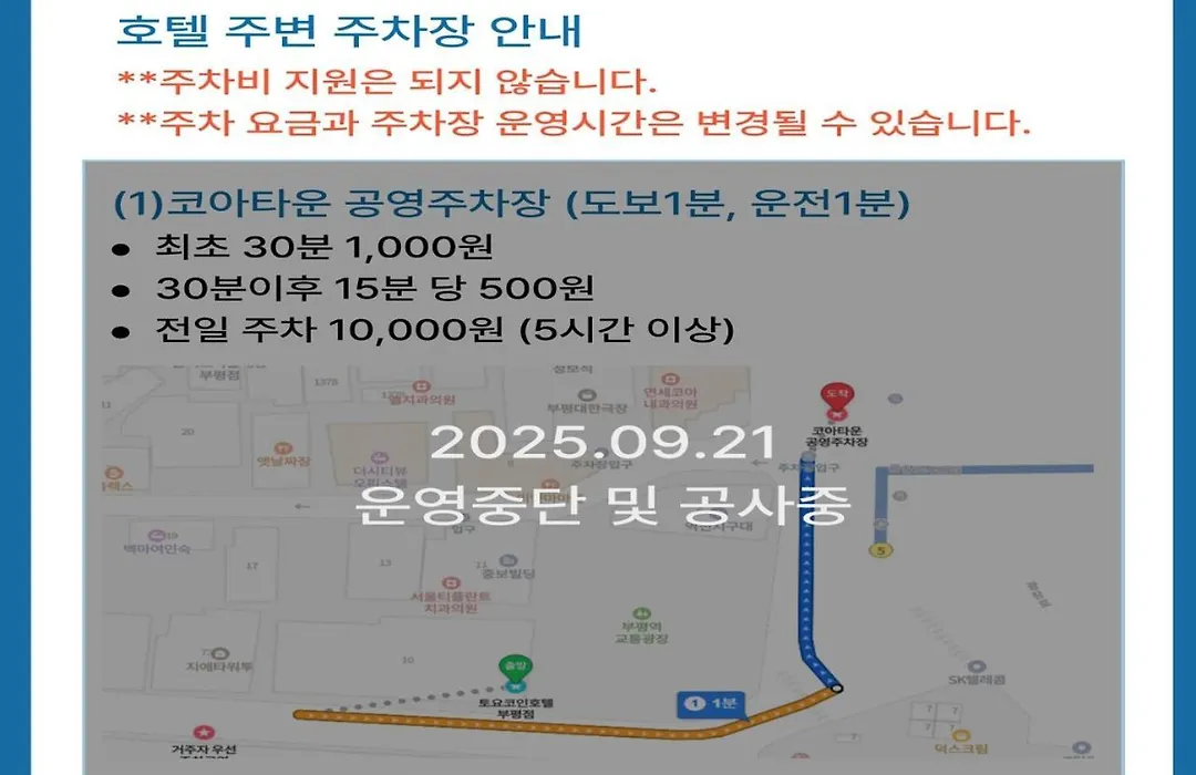 Situated only 1 km from Bupyeong Modoomall, the comfortable Toyoko Inn Incheon Bupyeong features Wi-Fi in public areas, and parking on site. The 3-star smoke-free hotel offers a banquet hall and sits nearly 25 minutes' walk from the Woongjin Play City.